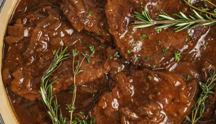Cube steak is cooked low and slow in the oven with a savory balsamic onion gravy.