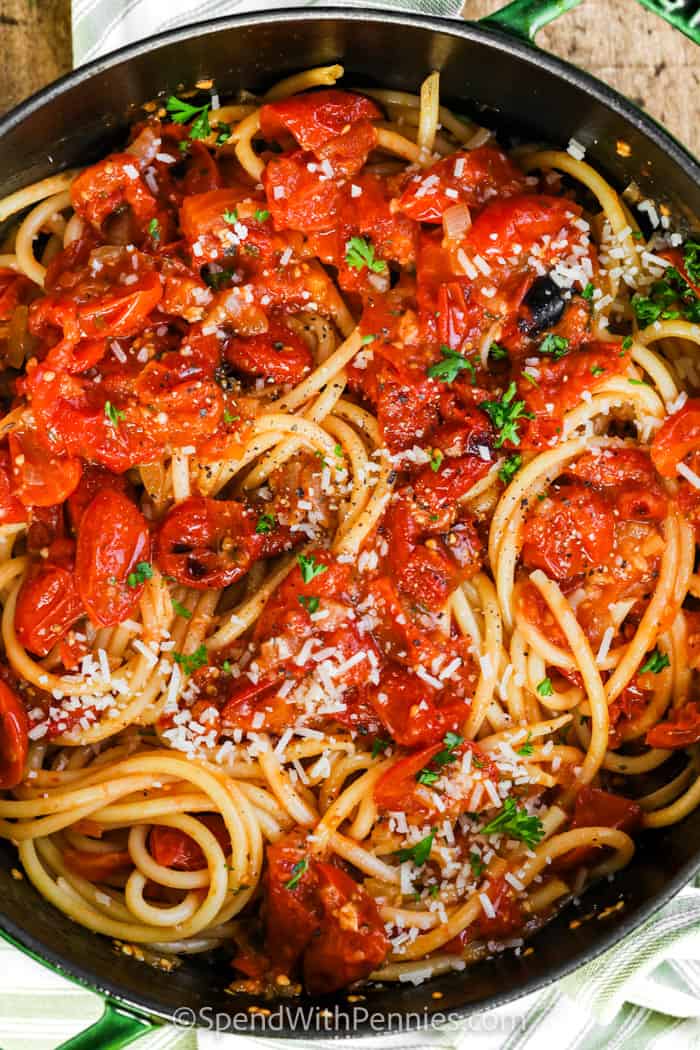 This pasta dish with made-from-scratch tomato sauce is so fresh & flavorful. Easy enough for a weekday meal, but elegant enough to serve at a dinner party!
