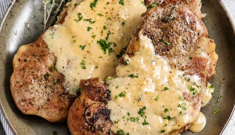 Rosemary and thyme seasoned pork steaks are cooked until tender and smothered in a garlic cream sauce.
