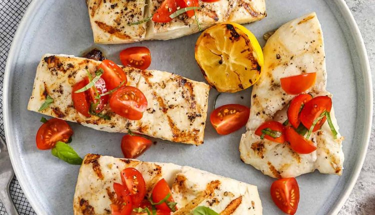Grilled halibut is a mildly sweet fish with a slightly smoky flavor and a bright tomatoey topping.