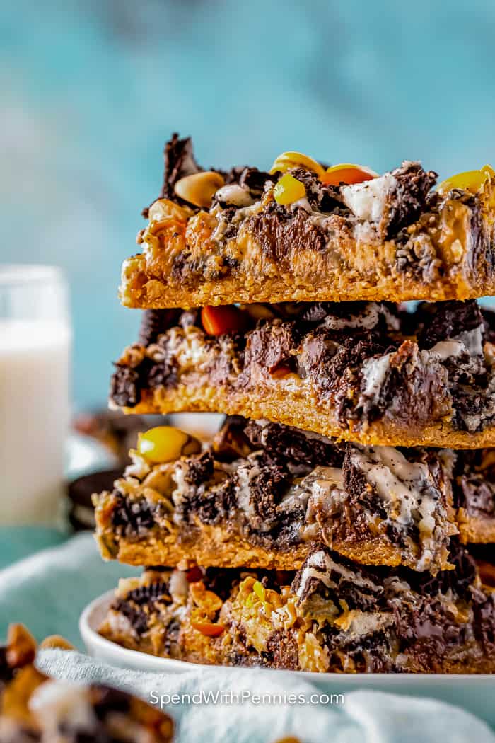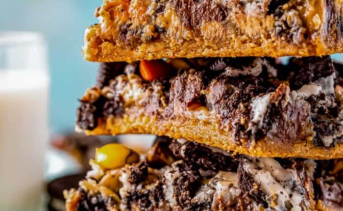 - Pour sweetened condensed milk over the top of the magic bars. Top with remaining crushed Oreo cookies & sprinkle on Reese’s pieces.